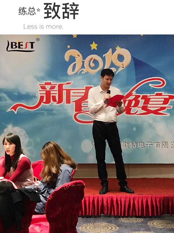 休息后,百斯特電子全員盛裝出席新春晚宴,晚宴在祥和而熱烈的氣氛中開始,首先由公司總經(jīng)理練總致辭,在這辭舊迎新,歡聚一堂的時刻,練總首先向全體員工致以誠摯的祝賀!回首2018,全體員工不辭辛苦,兢兢業(yè)業(yè)。公司的業(yè)務(wù)節(jié)節(jié)高升,取得了有目共睹,可喜可賀的成績。2019公司將聚焦現(xiàn)有產(chǎn)品,發(fā)展新產(chǎn)品,只要我們滿懷信心,攜手共進,我們一定能創(chuàng)造一個更加美好的明天!
